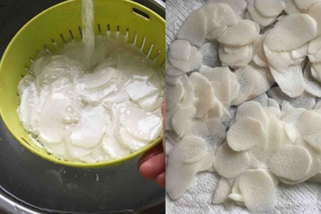 冲洗干净以后再用吸水纸将山药表面的水吸干,不然炸的时候会爆油。可以将山药片直接倒在吸水纸上会干得快一些。