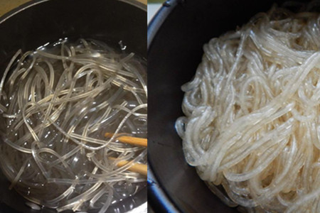辣椒很容易炒糊,一定要把握好火候,如果辣椒炒糊了,那么酸辣粉也就变味了。水烧至半开,就可以放青菜了,等待青菜煮半熟,把红薯粉放进去,经过泡制,粉丝很容易煮熟了,大概煮五分钟就可以了。吃的时候可以多加一些陈醋,这样味道才正宗,小心不要烫到。