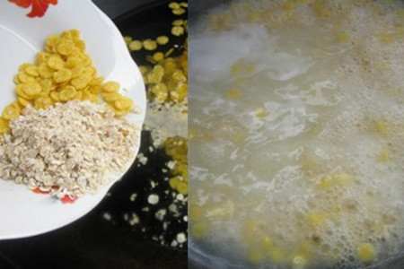 往锅中加入适量的清水,倒入沥干水分的燕麦片和玉米片。盖上锅盖,大火将锅中的燕麦煮开,煮开以后转小火煮10-15分钟关火焖一会儿,燕麦粥就做好了。燕麦片煮熟的时候不像大米会发泡体积增大,燕麦片的体积煮熟以后也增大不了多少,而且吸收不了太多的水分,所以往锅中放水的时候不要放太多,稍稍淹没淹没一点点就可以了。