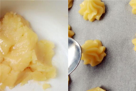 将鸡蛋用打蛋器打成蛋液如何慢慢的加入面团中,然后继续进行搅拌,直到两者混合后变成厚重的面糊为止。将面糊装入裱花袋,挤成小球状。