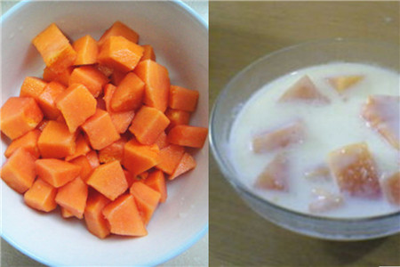 木瓜牛奶的做法不难,所需要的材料有:木瓜半个、牛奶一袋、莲子肉20克,红枣两枚,冰糖适量。第一步将木瓜洗干净后去皮,然后将其逐一切成块状,放入碗中备用,随后在将莲子肉洗干净,红枣用热水泡发。