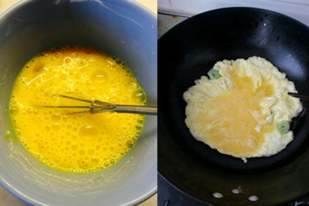 4、在炒锅之中下入适当的食用油,油温烧到七八成时。把鸡蛋下入油锅中,用铲子翻炒至鸡蛋液开始凝固,便可盛出。