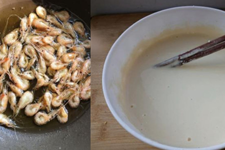 6、在平底锅中倒入些许的食用油,油温受热到七八成时。把之前制作好的韭菜鸡蛋液下入油锅之中,在上面均匀地码上些河虾。煎至一面金黄后,用铲子仔细翻面继续煎至金黄,便可食用。