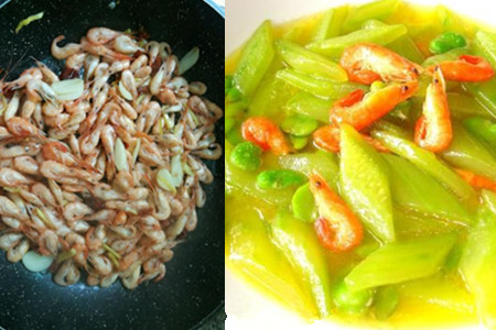 5、利用锅底的余油,加入蒜末进行翻炒爆香。待其香味散发后,把丝瓜放入锅中翻炒,逐一加入盐、河虾进行煸炒,临出锅前,撒上些味精,淋上些水淀粉进行勾芡。待汤汁收浓后,便可出锅食用。