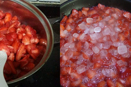 草莓本身就是多汁水果,所以在煮的过程中会产生很多果汁,没有必要加水。时间越长,果汁会越多,而且草莓也会变成更小的颗粒,整体变成糊状。这个时候就可以把冰糖放进去了,如果买的草莓比较酸,还可以加一些麦芽糖。因为加入了糖分,所以整个草莓酱会变得特别浓稠,因此很容易粘锅,所以这个时候一定要不停的搅拌。