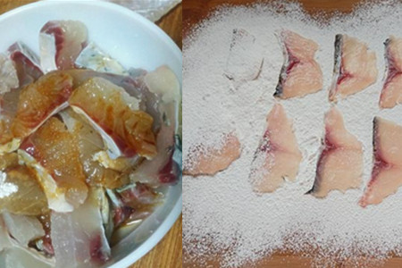 4、把干淀粉用筛子过滤一遍,把淀粉均匀地铺在砧板上。把腌制好的鱼片依次摆在砧板上,静置片刻后,把鱼肉的上面再次撒上过滤好的淀粉,使鱼片的两面均匀地裹上一层淀粉。