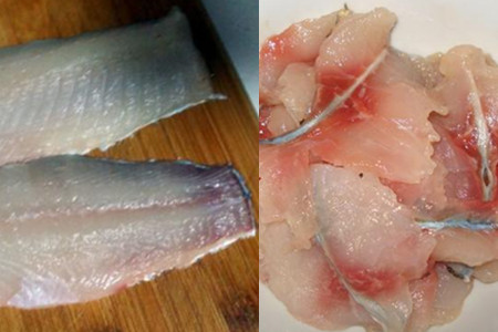 2、顺着鱼的脊骨,从鱼头部位开始用刀横切鱼肉。将脊骨两面的鱼肉横切下后,再用刀顺着鱼肉的纹路切成薄片。切鱼片的时候,要注意取出它身上的大刺。如果不擅长切鱼片或者是觉得切鱼片太麻烦费时,也可以请店家代劳或者直接从超市买现成的鱼片。
