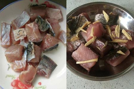 3、往切好的草鱼块中逐一加入些许的葱白、生姜末、些许的盐、料酒进行充分地抓捏,放在一旁腌制半个钟头左右。既可以使鱼肉均匀入味,又可以去除它的腥味。