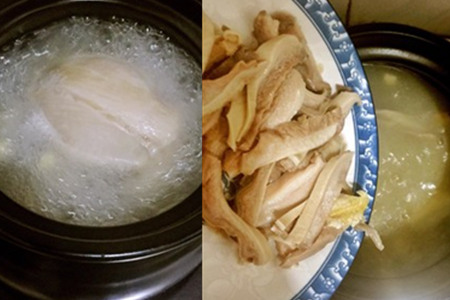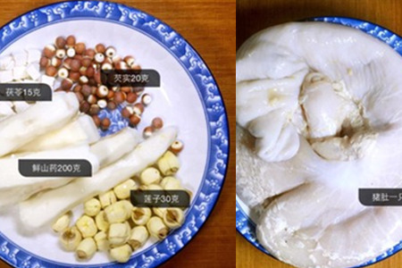 首先,准备好材料,分别是茯苓,淮山,莲子和芡实(或者是薏仁),猪肚,冰糖和清水,可以在中药店直接购买四神汤料包,这样比较方便;然后先把猪肚清理干净,一定要细细清理,因为猪肚腥味很重,会影响汤水的味道,清理完毕后放入烧开水中煮2分钟去除它本身的腥气,捞出冷水清洗。