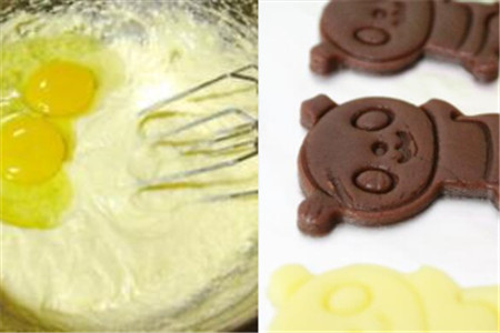 在之前的黄油里面也要加入少量的可可粉以及面粉,但是也不能够加的太多。像做馒头一样将它们揉成面团,其实外面买的饼干都是用很多的模型做出来的,所以我们想要做出不同形状的饼干,也可以买一些模具回家。将模具覆盖在不同颜色的面团上面,再组合成饼干的形状就可以了。