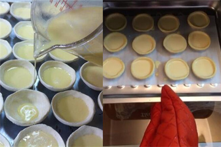 当面粉调和完毕之后,我们需要准备鲜奶油与牛奶,加入适当的炼乳和砂糖,这样可以提升蛋挞的奶香味,让蛋挞的口感更好,当然蛋挞少不了鸡蛋的参与,不过鸡蛋需要去掉蛋清,只留下蛋黄。然后将其调和在一起,用锡箔纸做出蛋挞杯的形状,用面粉围着锡箔纸的形状做一个蛋挞杯,然后倒入搅拌好的蛋奶,放入烤箱当中加热烤熟即可。
