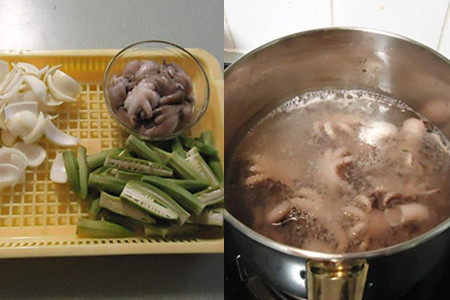 墨鱼仔洗干净装入容器里,加入少许食盐和胡椒粉,用手拌匀,腌制片刻。洋葱洗净切成细丝,秋葵洗净去掉头部,一切为二。取一个煮锅,洗净置于火上,注入适量清水,开大火煮沸,倒入腌好的墨鱼仔,煮两分钟,捞起用清水冲凉,滤干水分待用。
