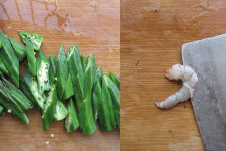 皮蛋去掉外壳切成小块,秋葵洗净切成小片,大蒜去掉蒜衣切成片,全部辣椒洗净切碎。