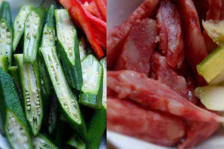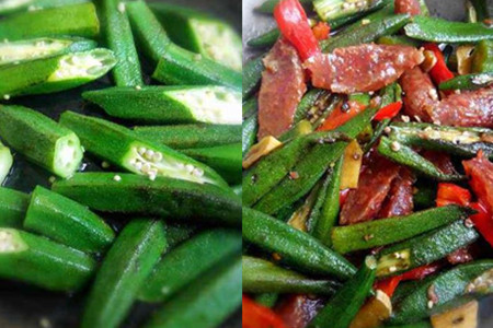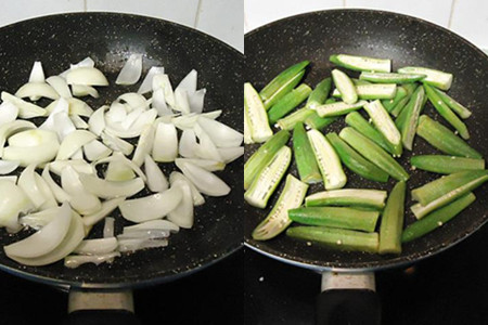 取一个炒锅,洗净置于火上,加入适量橄榄油烧热,下洋葱丝,调入少许食盐,快速翻炒几下后盛出备用。用炒锅里剩余的橄榄油把秋葵煎至略微变黄,即可盛起待用。