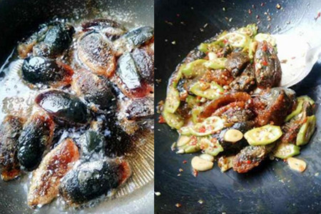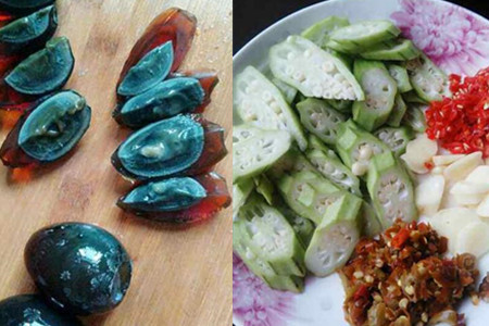 取一个炒锅,洗净置于火上,倒入适量油,油热之后,下切好的皮蛋煎制,煎成焦黄后盛出备用。用锅里剩下的热油把蒜粒和辣椒煸香,然后放入秋葵片,将煎好的皮蛋回锅,调入适量生抽、蚝油和料酒,翻炒均匀后起锅装盘。