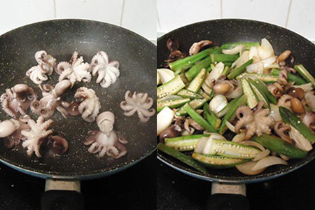 再往锅里加少量橄榄油,放入滤干的墨鱼仔,调至大火快速炒开,烹入适量白葡萄酒,生抽、白砂糖和胡椒粉,炒匀。接着把秋葵和洋葱回锅,用铲子炒匀即可熄火装盘。