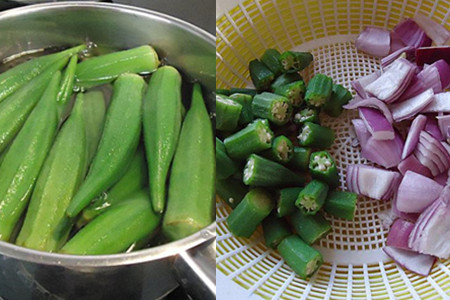 秋葵洗净放入开水锅里烫一下,捞出用清水冲凉,去掉头尾切成小段。洋葱洗净切成小粒。