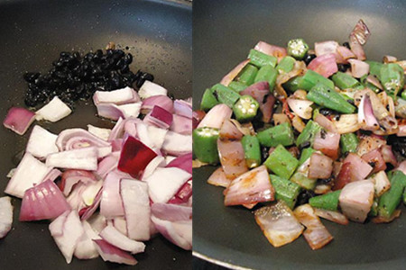 取一个炒锅,洗净置于火上,注入少量的橄榄油,油热之后,下豆豉煸炒。豆豉煸出香味之后,放入洋葱一起煸炒。煸炒片刻之后,烹入适量生抽炒匀,再放入秋葵段,调入适量鸡精,翻炒两分钟后熄火。秋葵用开水烫过再切段,可以保留它的营养。洋葱下锅不需要炒太久。