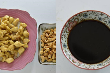 炒锅放油烧热,分别将腌好的鸡丁和腰果下油锅炸制,炸成金黄色捞出锅滤干水分。取一小碗,加入适量生抽、白糖、香醋和食盐,搅匀待用。