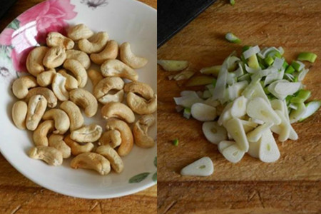 腰果放入微波炉加热三分钟后取出自然冷却。葱姜洗净切成末,大蒜去掉蒜衣切成片。