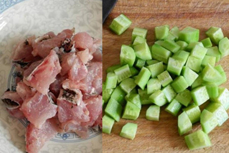 石斑鱼刮掉鱼鳞,去掉内脏,剔下一块鱼肉,切成小块,装入盘中,加适量食盐、料酒,搅匀腌制十分钟。黄瓜洗净削皮切成丁状。