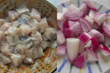 鱼肉洗净切成肉丁,装入碗中,加入适量、白酒、白糖、鸡蛋清、白胡椒粉、十三香、食盐和食用油,用手搅匀,腌制二十分钟。洋葱洗净切成丁状待用。