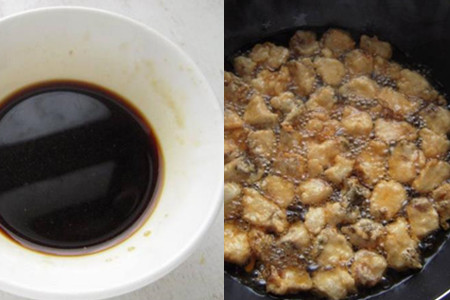 取一小碗,加入适量姜汁、酱油、香醋和白糖,搅匀待用。炒锅置于火上,放入适量食用油烧热,油热之后,将腌好的鱼丁下锅炸制,鱼丁炸成外皮金黄酥脆,捞起滤干油分。