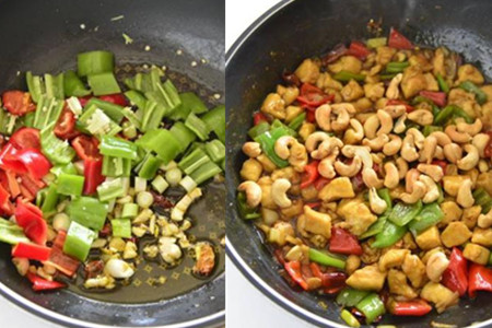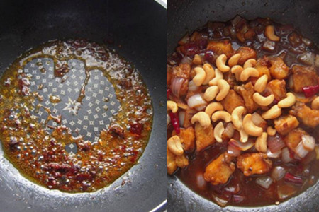 将油锅里的热油倒出,留少许在锅底,下蒜末和干辣椒爆香,加入青红椒片煸炒片刻。接着将炸过的鸡丁下锅,料汁搅匀淋入锅内,再淋入适量水淀粉,大火煮开后关火。关火之后放入炸过的腰果,用铲子炒匀即可食用。关火之后,才将腰果下锅炒匀,这样可以保证腰果的酥脆的口感。