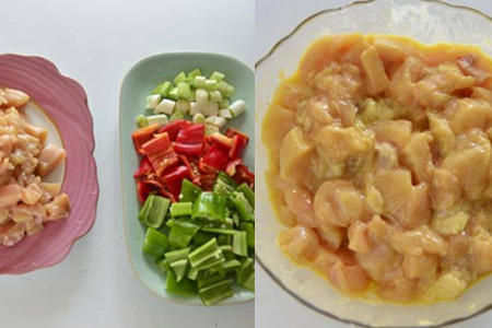 鸡肉洗净切成丁状,大葱洗净切成圆段,青红椒洗净切成小片。鸡肉用蛋黄、淀粉和食盐腌制十分钟。