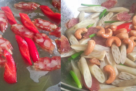 炒锅热油,下红椒和腊肠煸香,接着加入藕带和韭菜花,大火快速翻炒。然后倒入炸过的腰果,调入适量食盐和鸡精炒匀即可。