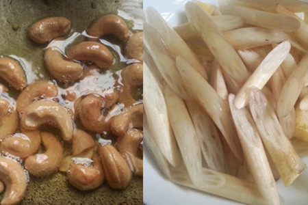 食材:藕带400克、腰果200克、红椒、韭菜花、腊肠、盐、油。