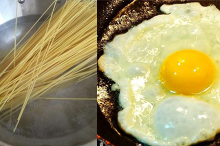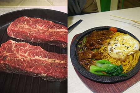 8、把铁板烧热后,在上面逐一放上牛排、鸡蛋、意面,淋上制作好的黑椒酱汁。也可以根据自己的口味喜好,往里加入些蔬菜。