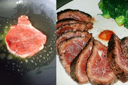 7、再往煎锅中放少量的食用油,如果煎锅本身没什么油的话,那要往里多放些油。大火煎制牛排,一定要使用大火。这样既能锁住牛排的水分,又可以使牛排吃起来不会很干柴。