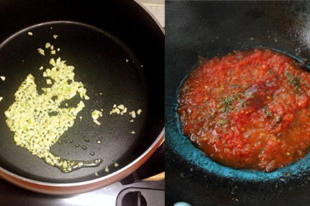 4、在炒锅中下入适量的食用油,油温加热片刻后。把蒜粒下入油锅中爆香,待其变成金黄色后。把洋葱丁放入锅中一齐翻炒,这时候再把之前制作好的番茄汁倒入锅中。往锅中逐一加入蚝油、白砂糖、适当的清水,汤汁熬煮浓稠后,加入些黑胡椒粉、鸡精进行调味,便可关火。
