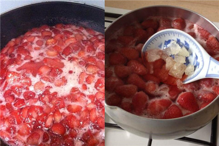 将清洗好的草莓一个一个的去除根蒂,然后将所有的草莓放入搅拌机当中,让草莓经过充分的搅拌,成为草莓泥。在草莓还在搅拌的过程当中,我们可以先准备好冰糖或者是白砂糖,因为这些是接下来需要使用到的辅助材料。草莓泥制作完成后,我们将其倒入炒锅当中,日常生活中所使用的平底锅也可以,用小火热锅,倒入草莓泥和白砂糖。
