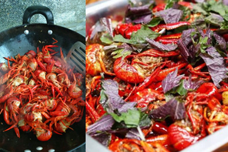 6、小龙虾七八分熟时,把处理好的紫苏叶加入其中反复翻炒,使紫苏叶的香味充分散发。临出锅前,撒上些黑胡椒粉炒均,便可出锅食用。