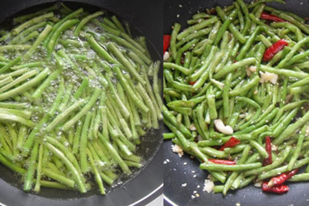 炒锅放入适量油,油量要多一些,开火烧热,油热之后,下豇豆段油炸,炸成油绿色捞起滤干油分。将油锅里的热油倒出,留少许在锅底,下青红花椒炸制。青红花椒炸出香味后,加入大蒜末和干辣椒段煸炒。炒出香味之后,下炸过的豇豆段,调入适量蚝油、鸡精和食盐,撒上一些白芝麻,炒匀即可关火。