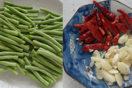 豇豆洗净切成长段待用。干辣椒洗净用剪刀剪成小段,大蒜去掉蒜衣拍碎待用。