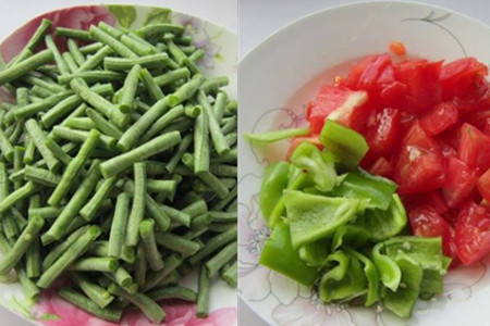 豇豆洗净切成寸段,青椒洗净切成小片,西红柿洗净切成小块。
