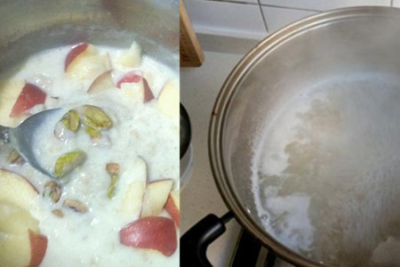 三, 燕麦在水中煮一到两分钟之后即可放入苹果,然后用小火慢炖,待其燕麦粥熬至粘稠的状态,一般来说就半个小时左右即可。