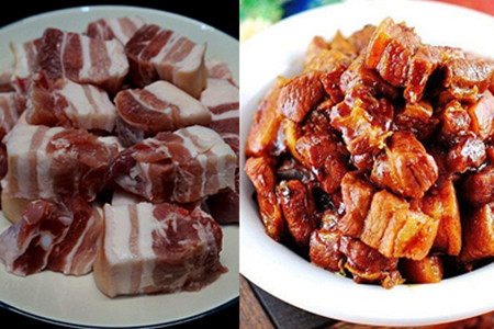 第二,将五花肉洗净切大块,下到热水锅中,调入少许料酒,把肉焯一遍水后盛起晾干。
