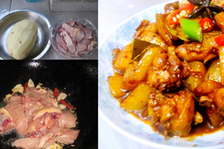 3、土豆烧鸡肉新鲜的鸡肉用刀剁成大小合适的块状,这样方便食用。土豆去皮以后切成块状,还需要准备一些大料和辣椒、生姜。锅里面倒入一些油,将鸡肉和姜片一起放进去翻炒,如果有料酒,可以加一些进去,同时还需要加入八角、桂皮翻炒5分钟。再将切好的土豆倒进去一起翻炒,加入一些水,使用中火焖煮15分钟。