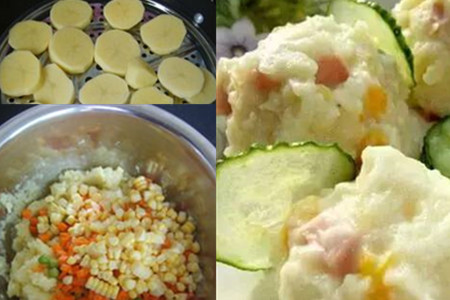 2、玉米粒土豆泥土豆去皮以后,切成块状放入蒸锅里面蒸软,然后压成土豆泥。将玉米粒和胡萝卜放入油锅里面翻炒熟。将它们玉米粒、胡萝卜、土豆泥混合在一起,加入一些盐,将它们搅拌均匀就好了。