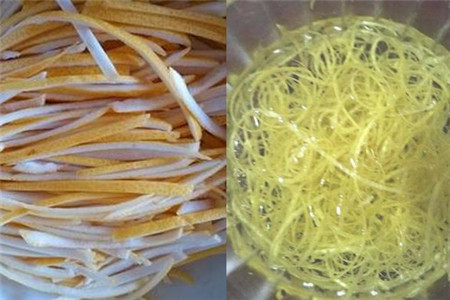 然后就把削下来的柚子皮用刀切成丝状,再用放食盐进柚子丝状皮中,不断的揉搓,这样是为了使柚子皮中的苦涩味道都析出来,搓好之后再用清水把柚子皮清洗干净,这个步骤重复两三次会比较好。之后在把柚子皮放进装有清水的盆中浸泡一晚,要加点盐进去,这样可以帮助去除柚子皮中的苦味。然后可以把剩下的柚子肉撕碎,或可以用搅拌器粉碎成肉泥。