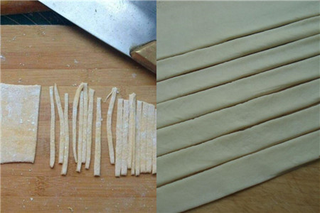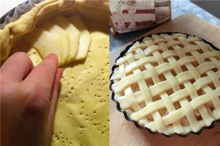 剩下的一部分面团,我们可以用擀面杖将其擀成长方形,大小可以根据个人需要制作的苹果派大小来决定。之后我们将炒熟的苹果均匀的撒在擀好的长方形面团上,将之前切好的条状面块,仔细且整齐的斜放在苹果上,值得注意的是,需要将条状面团的长度把握好,对角所需要的长度比较大,可以适当的裁取两端的面团,尽可能的让其能够完全覆盖。