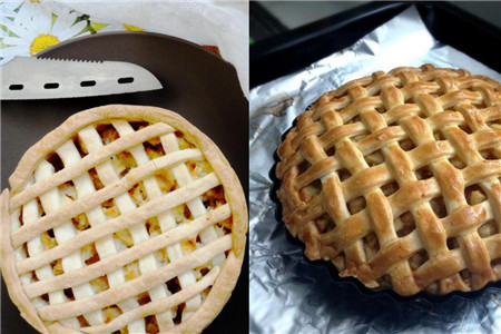 按照交叉的形式将条形的面团排列好之后,我们就可以将其放入烤箱。烤箱的温度设置在200度左右即可,通常来说需要半个小时左右的时候才可以完全的将其烤熟。烤熟之后的苹果派面包就可以立即的食用。对于部分家庭里有小孩的人来说,可以在苹果派面包的表面涂上一层蜂蜜,这样不仅可以让苹果派的色泽看起来更加的艳丽,还可以增加食欲。