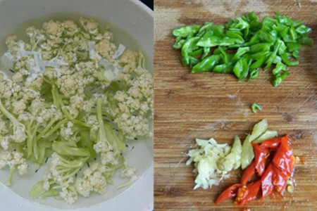 花菜洗净放入清水里,加少许盐,浸泡半小时,捞起滤干备用。青椒洗净切成小段,大蒜去掉蒜衣切碎,泡椒小米椒切碎。烧一锅开水,放入洗净的花菜烫一下,捞起,用凉水冲凉。