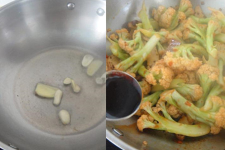鸡蛋煎熟之后,用铲子拨到一边,放入洗净的花菜,翻炒均匀。接着下番茄丁,调至大火翻炒,烹入适量生抽和食盐。然后注入适量清水,大火炖煮,煮至汤汁变红,淋入适量香油即可。用平底锅炒制花菜,可以使得花菜受热均匀,炒出来的花菜更鲜嫩。