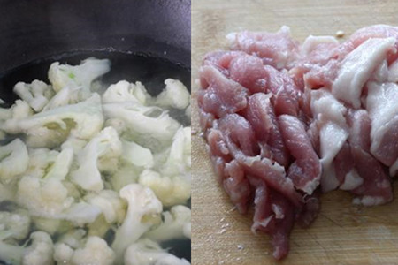 大蒜去掉蒜衣切成片,小米椒洗净切成小段,花菜洗净用开水烫熟捞起滤干。五花肉去掉表皮,洗净切成薄片。