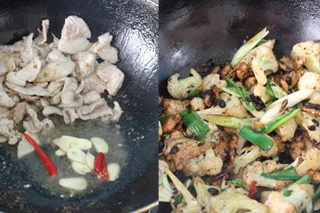 炒锅放适量油烧热,油热至八成时,下五花肉片煸炒。肉片煸炒出肥油之后,下蒜片和辣椒煸炒。炒出香辣味之后,加入豆豉翻炒,把豆豉的酱香味炒出来。接着加入蒜苗段和烫熟的花菜,翻炒至食材入味即可。豆豉有一定的咸味,所以不再另外加盐,再加盐会使得整道菜太咸。